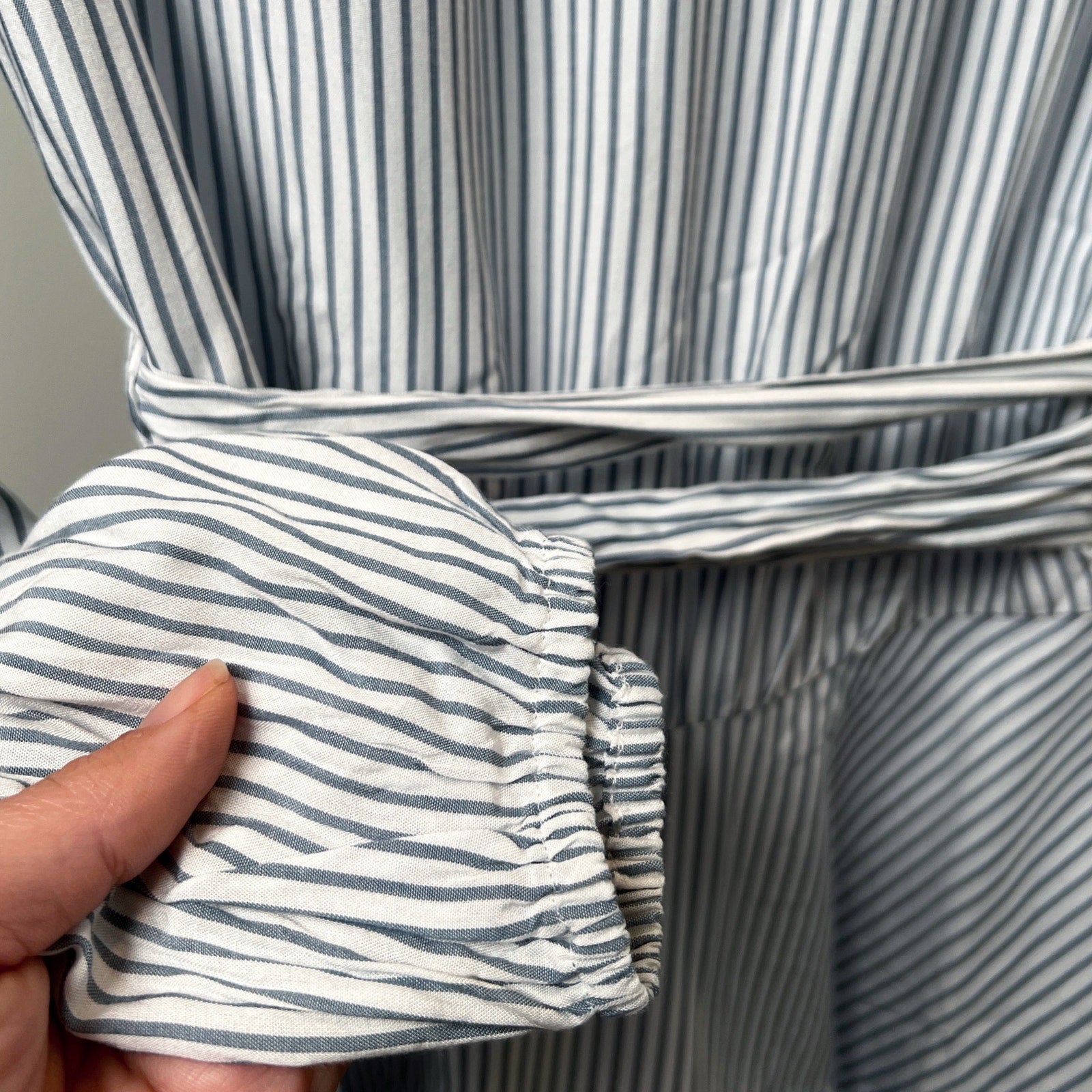 Excellent pre-loved condition. Elastic at cuffs, small snap closure at chest.  White with grey stripes. Incredibly soft, lightweight and comfortable.