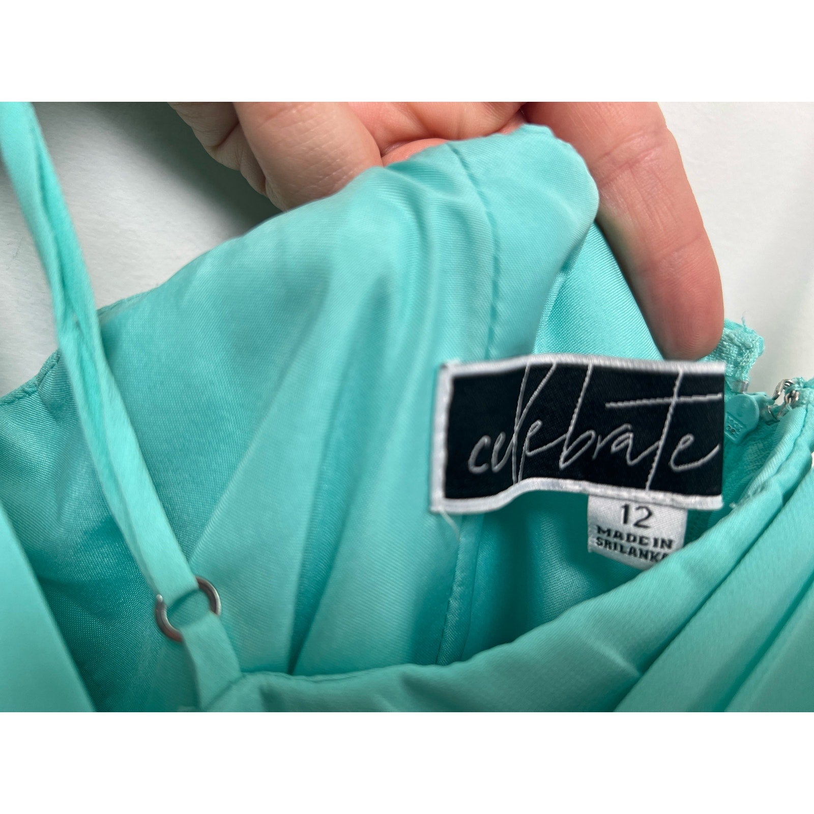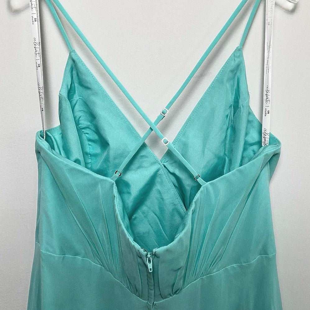 Used as bridesmaid's dress, in excellent condition and worn only once, this gorgeous dress from David's Bridal brand Celebrate also works as a lovely wedding guest/special occasion dress.  Adjustable spaghetti straps cross at back.  Size 12. Please see garment measurements when flat: