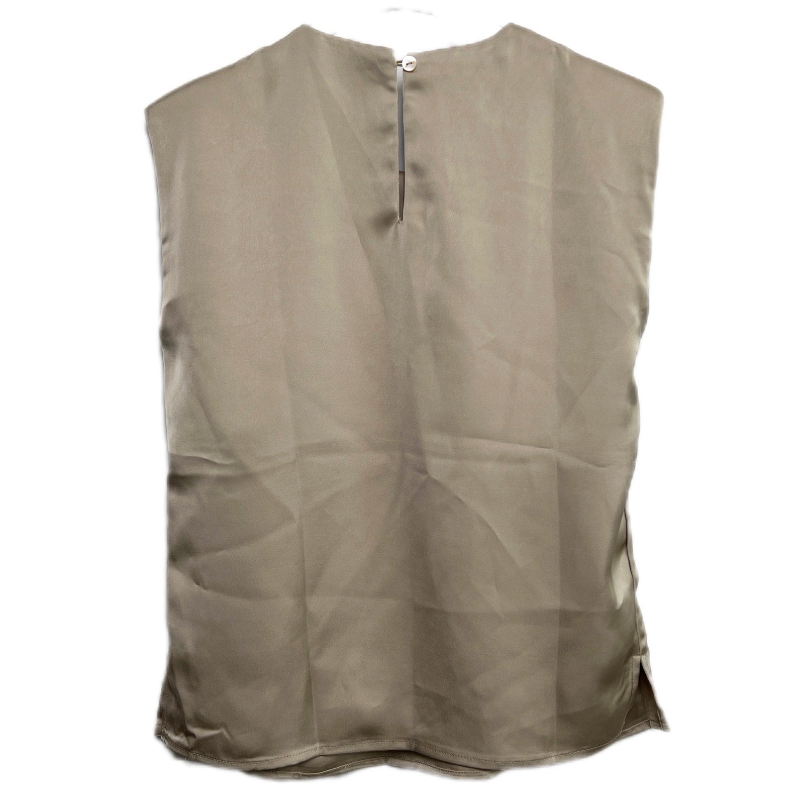 Beautiful, soft Commense blouse, new with tags. Perfect for work or any upscale casual look.  **BELT IS NOT INCLUDED* but styled here with one to show how it looks cinched at the waist.  Details: round neck, sleeveless, shoulder pads/structure shoulder, shoulder pleats, back button.  Color is like champagne/shiny tan/khaki.  Measurements when garment is flat: