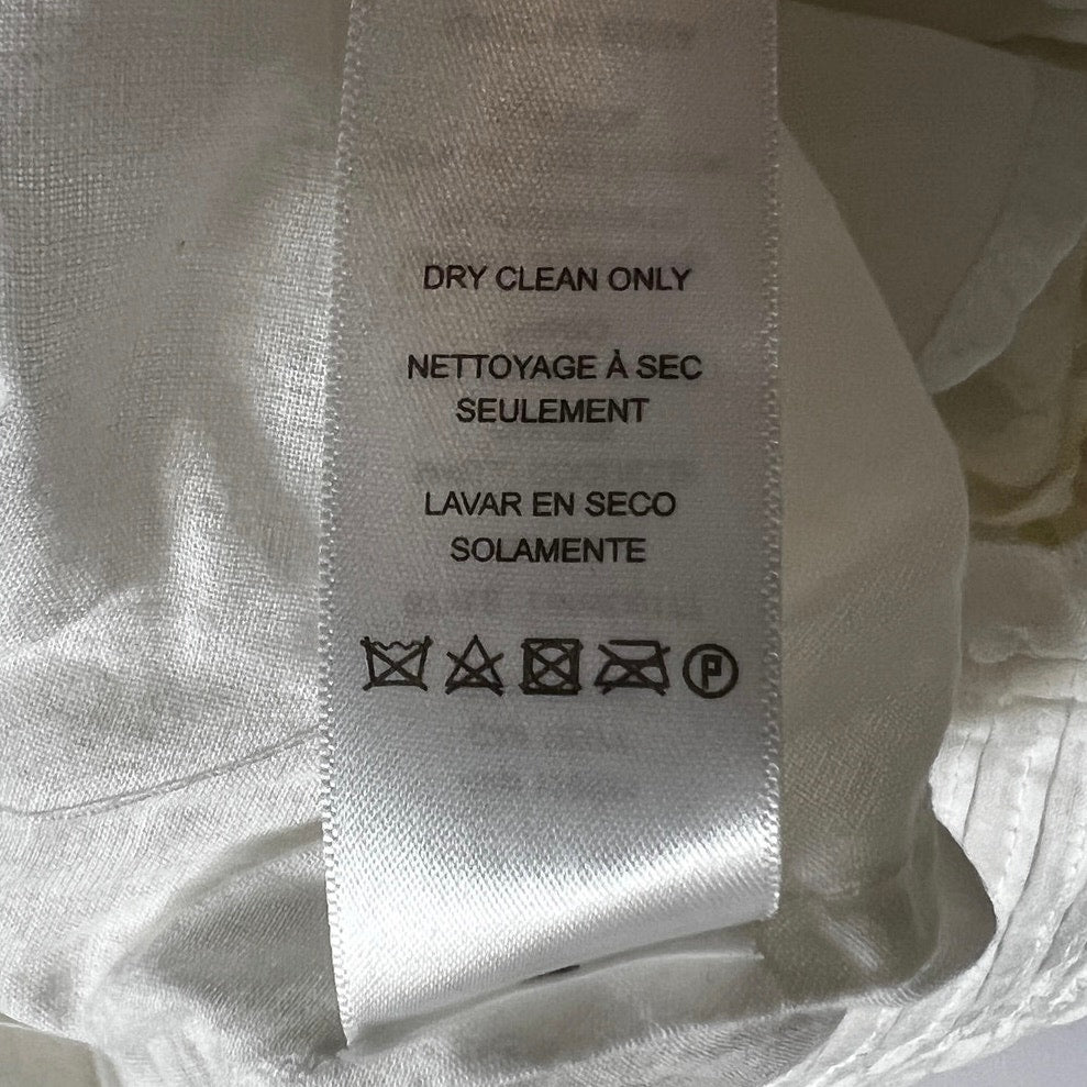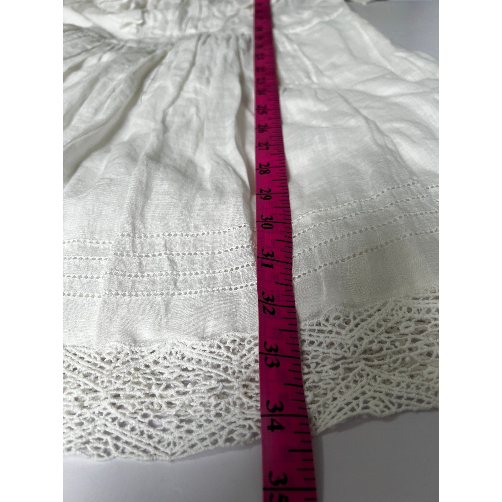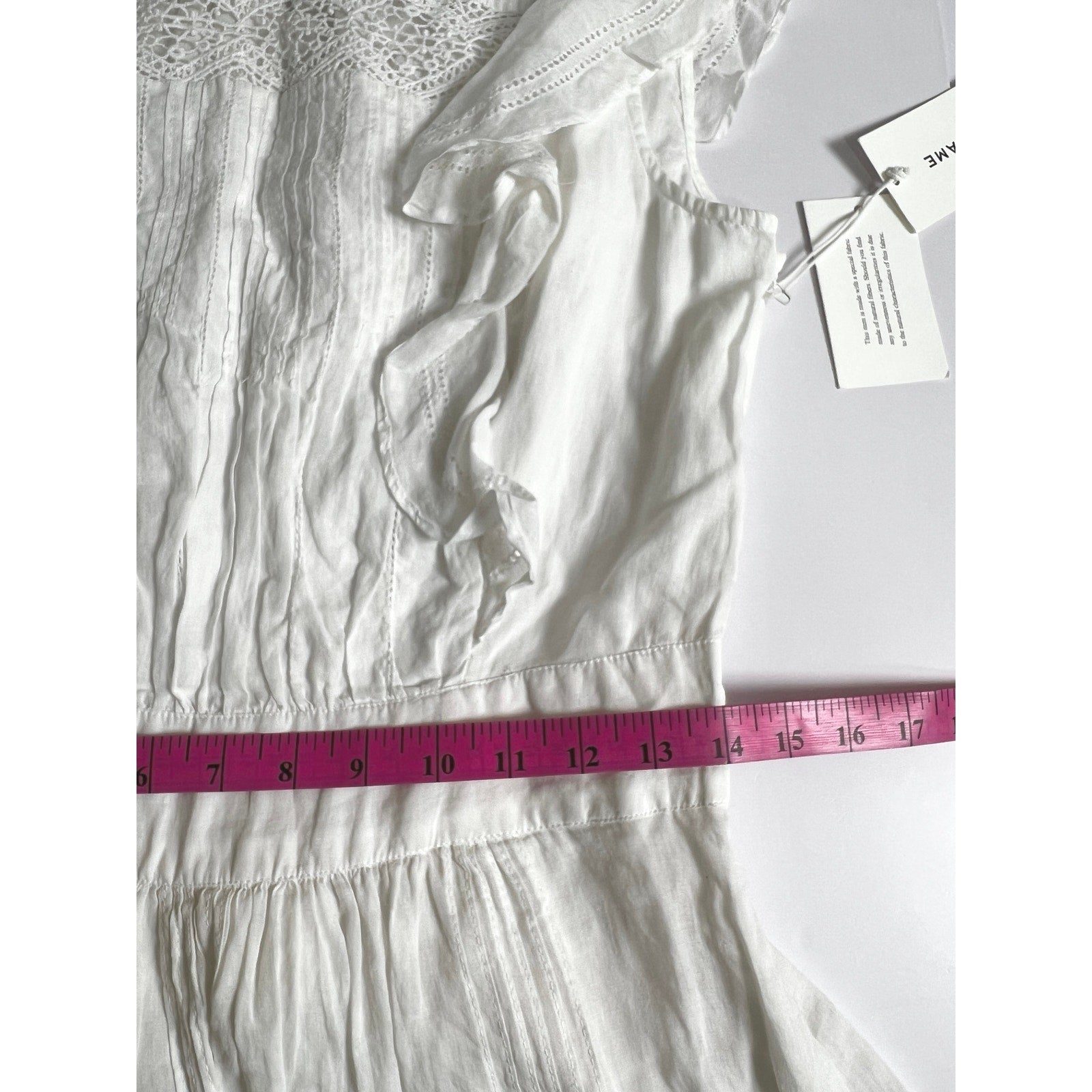 Romantic and lightweight, this FRAME white dress is made of 100% cotton and features beautiful lace trim at the hem, flutter ruffle sleeves, and a flowy silhouette. It’s semi-sheer with delicate pintuck pleats and crochet lace accents at the chest. Perfect for warm-weather outings, vacations, or casual summer events.