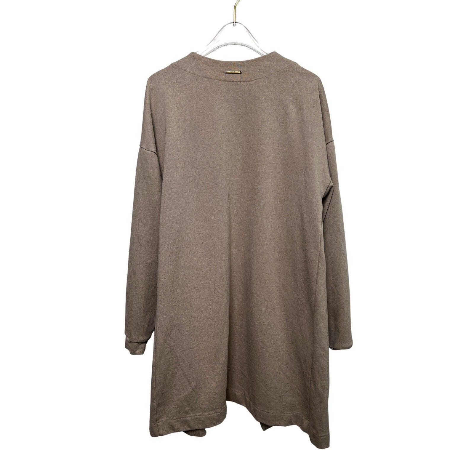Pre-owned Gymshark cardigan in good/fair condition.  Signs of wear include some discoloration at the back of neckline, and a very small spot on the left side (pictured, but would need to zoom in very close to see-not very noticeable.)  The rest of the garment looks good.  Belt is NOT included.  Shown styled with one in one photo only for inspo.  Color is light tan/dark beige, long sleeves, open-front, logo embroidered on upper left.  58% Cotton blended with Polyester.  Measurements when flat: