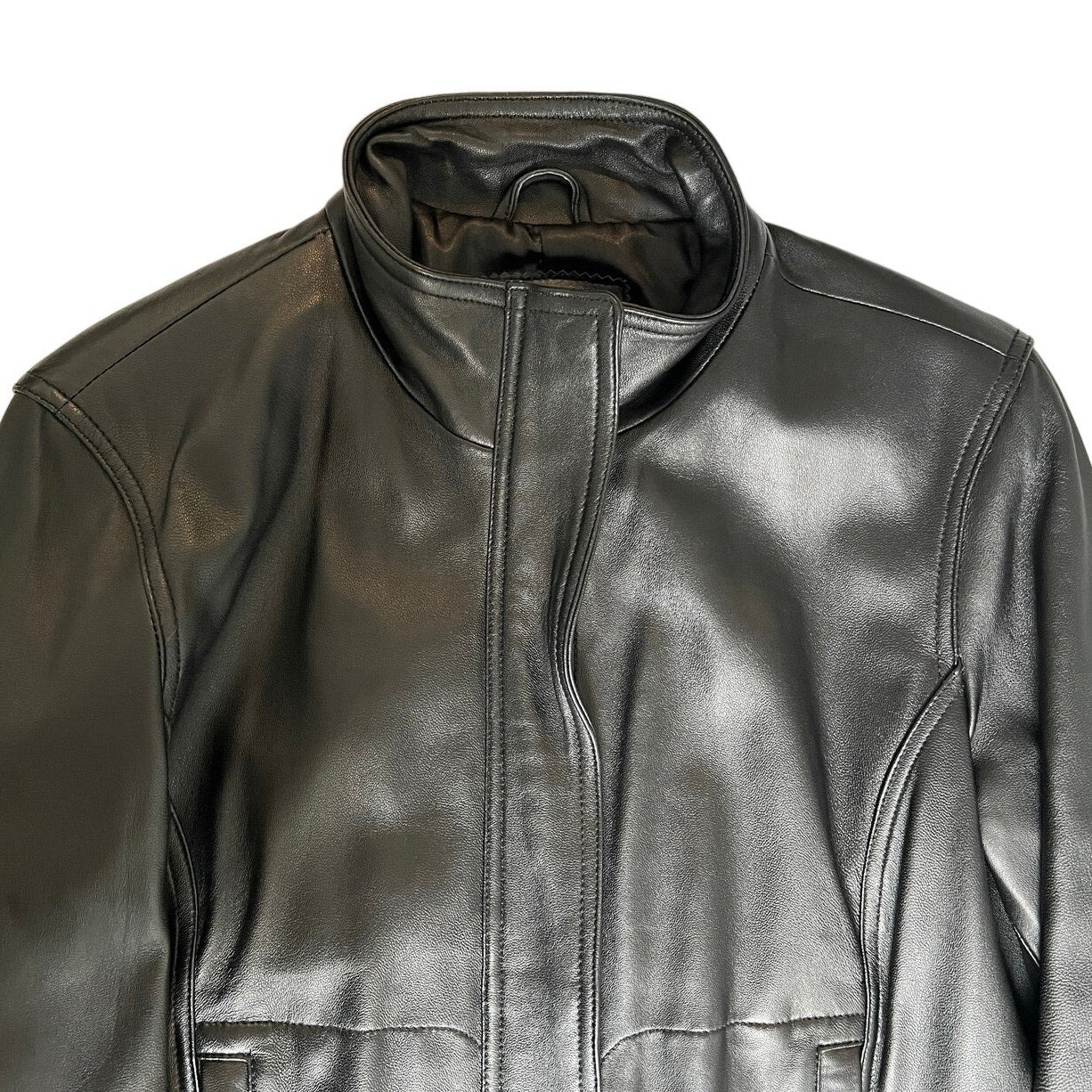 Gently pre-loved 100% geniuine lamb leather jacket from Uniform Leather x John Paul Richard.  Details: stand-collar, long lseeves, multiple zip-up pockets, zip front closure.  Condition: very good pre-loved, very light wear on right back shoulder (see photos).    Measurements when flat:
