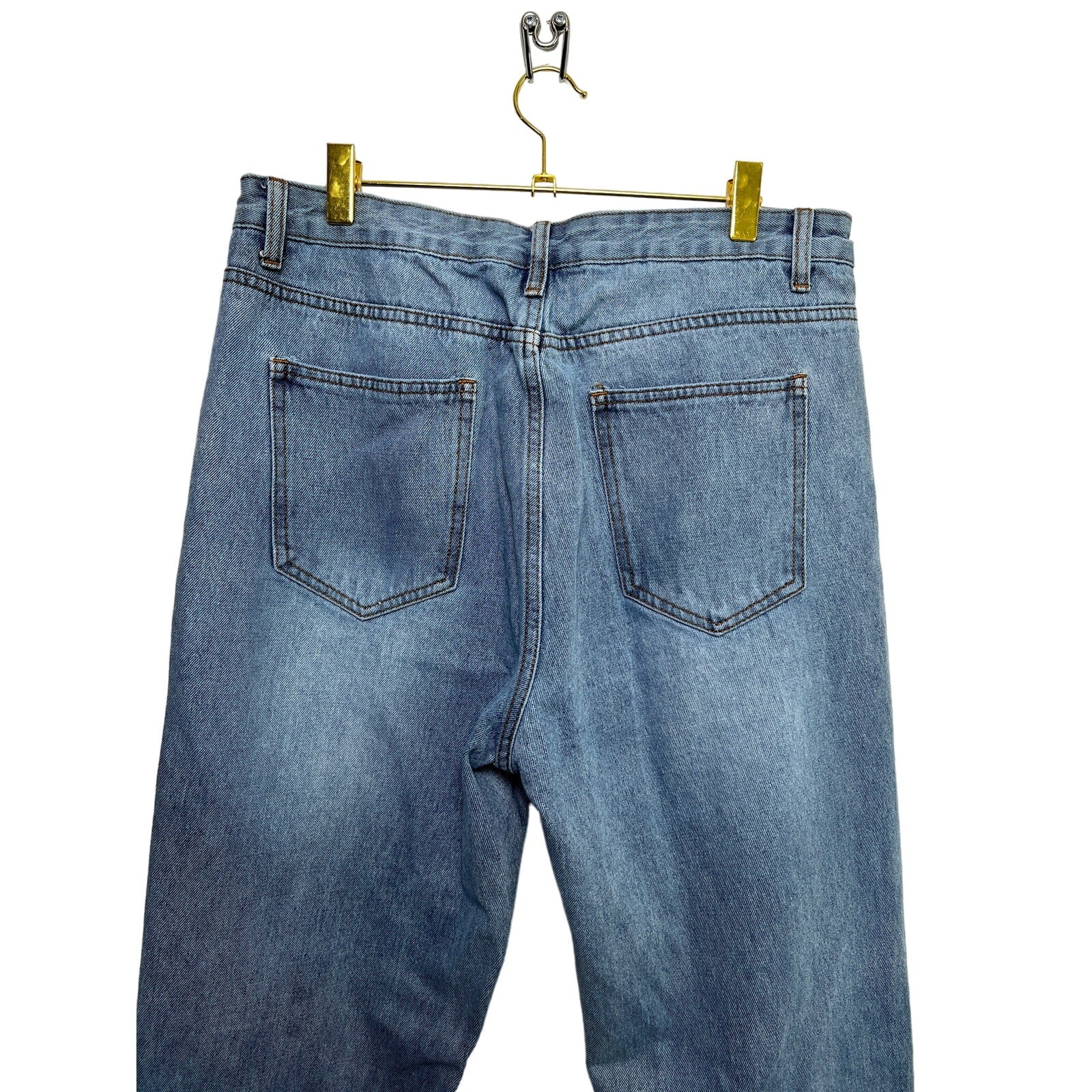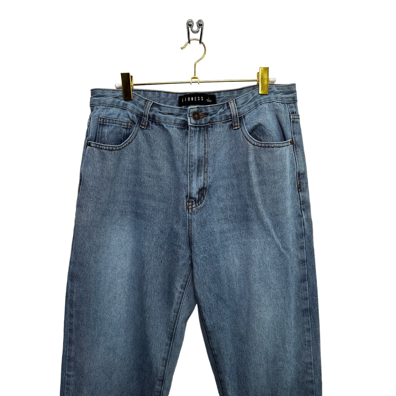 Gently pre-loved Lioness Side Slit Straight Leg Jeans in size Large. Very good condition. Model measures 30" waist, 41" hips, 5'4" height.  100% cotton. Measurements when flat:
