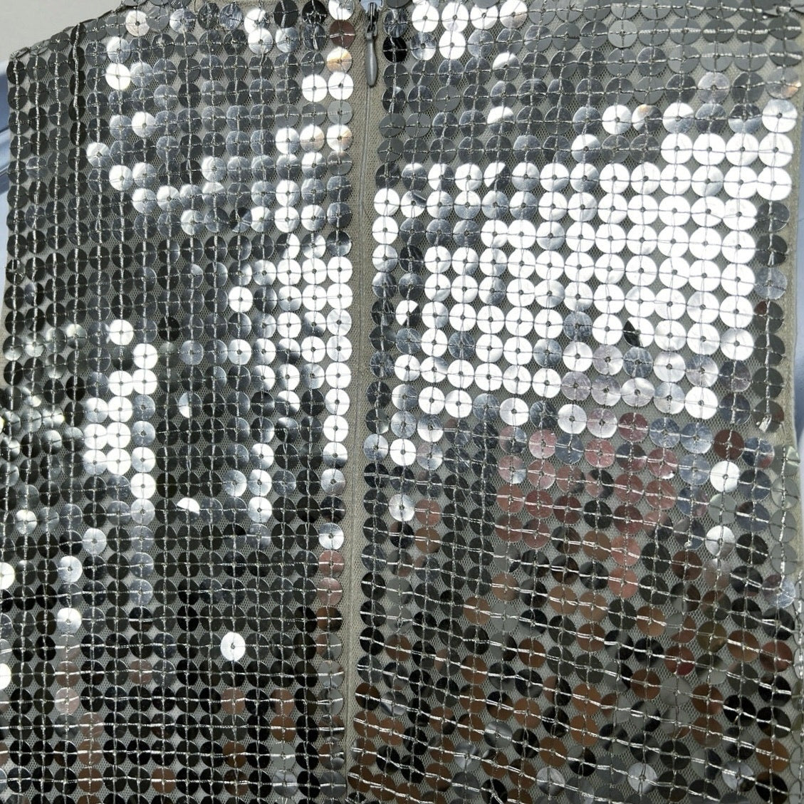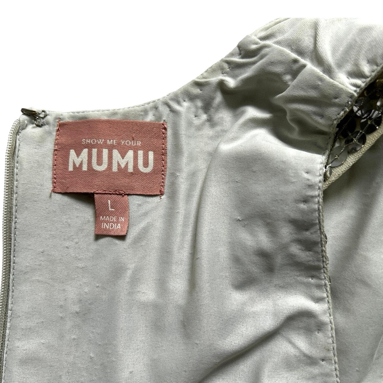 Gently pre-loved Show Me Your Mumu Silver Sequin Disco Dress, Large, in good condition.  Midi/Midaxi Length with a thigh-high slit.  Lined at the bodice and up to the slit, but sheer at the legs.  Back-zip closure.  Sleevess, crew neck.