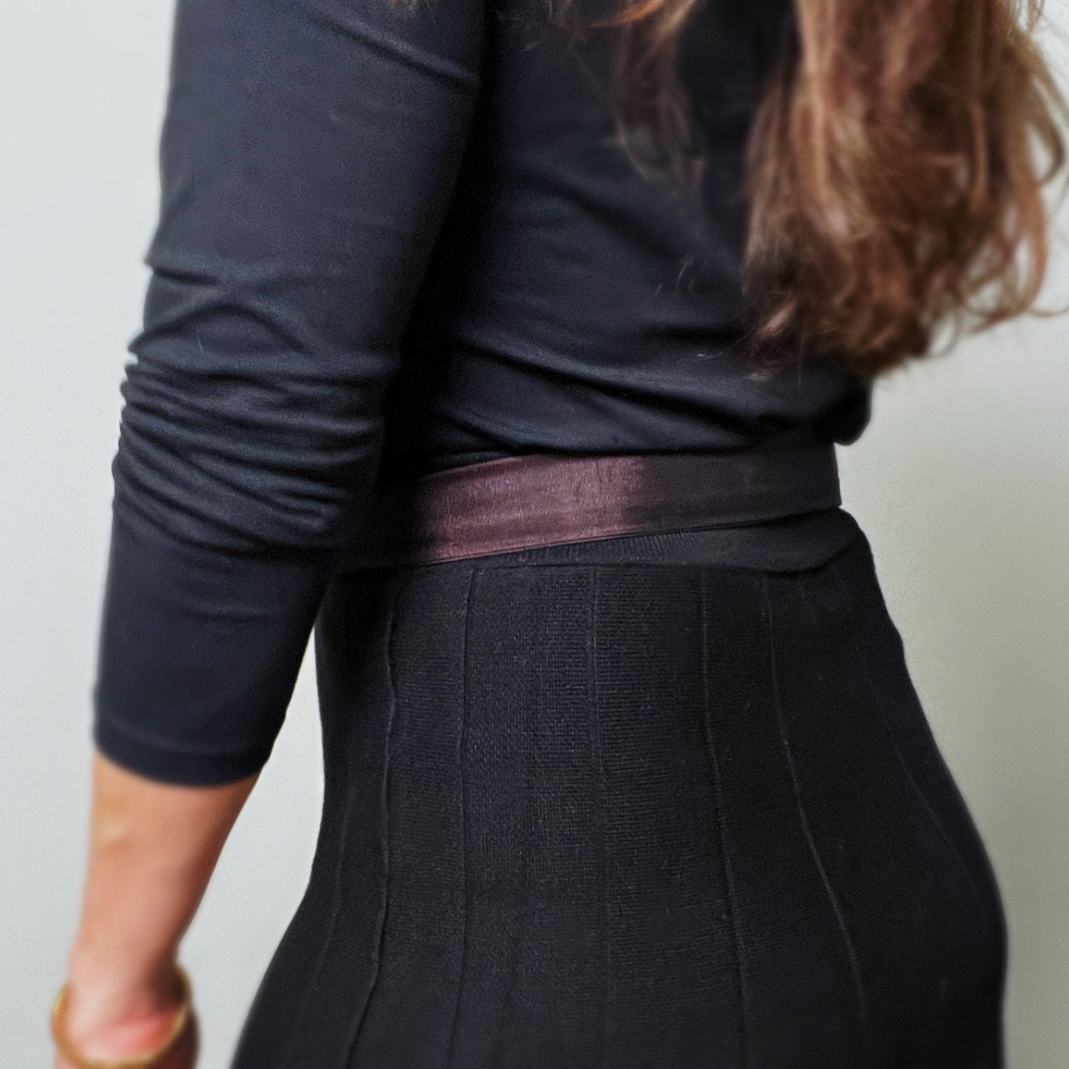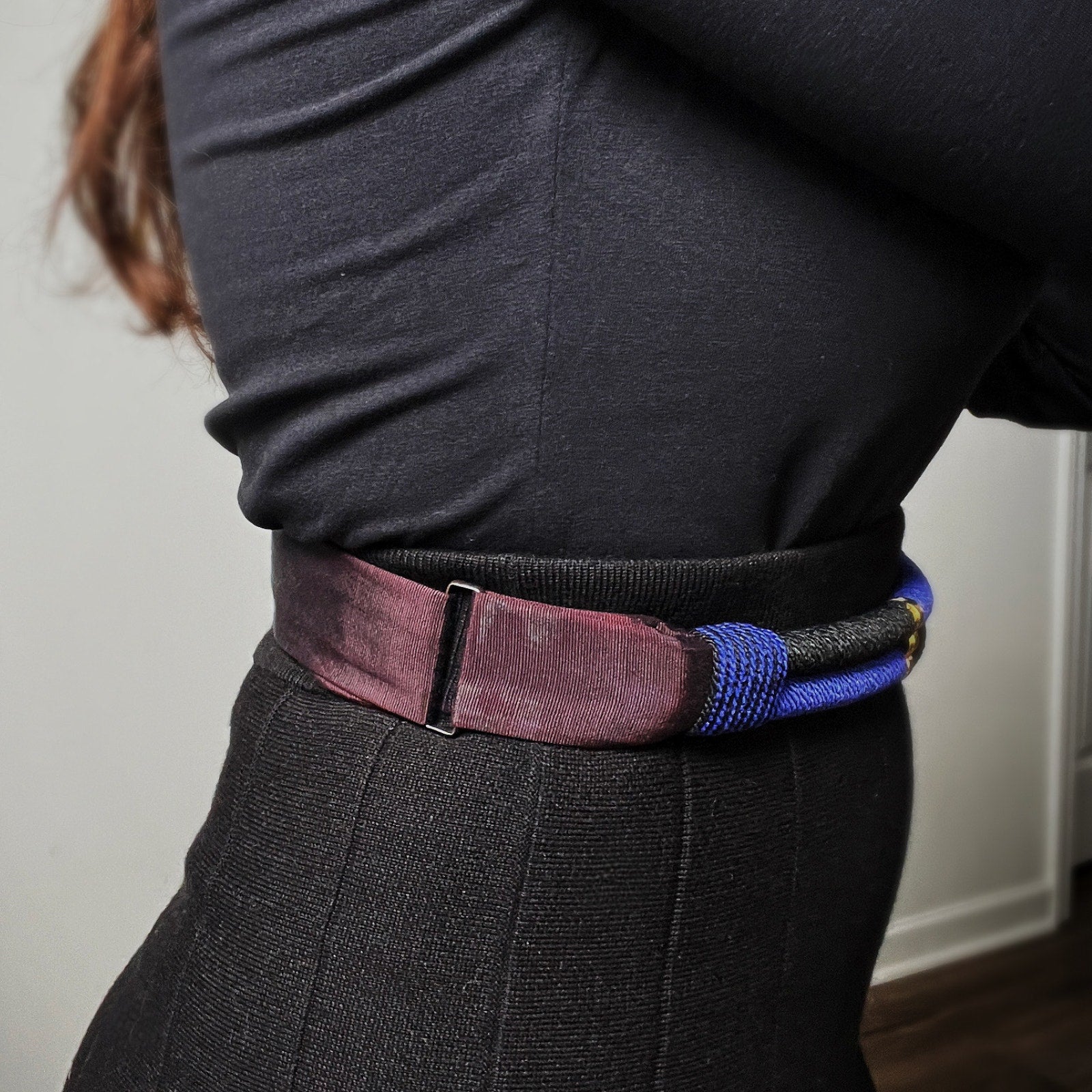 Unique vintage 80s belt with a double black and blue rope-like design at front with gold hardware accents.  The back part is a deep purple/burgundy fabric that folds inward and cinches with velcro.  The back fabric shows some signs of age with light fading here and there, but the front looks great.  Hardware and brand label are intact.  Carolyn Tanner was a unique belt design house from Atlanta, making this a rare find!  Model is wearing the exact belt and is typically a size 8/30" waist.  The velcro strip is long, making it possible to cinch tighter for smaller sizes.  Full length of belt from end to end is 34" inchest.