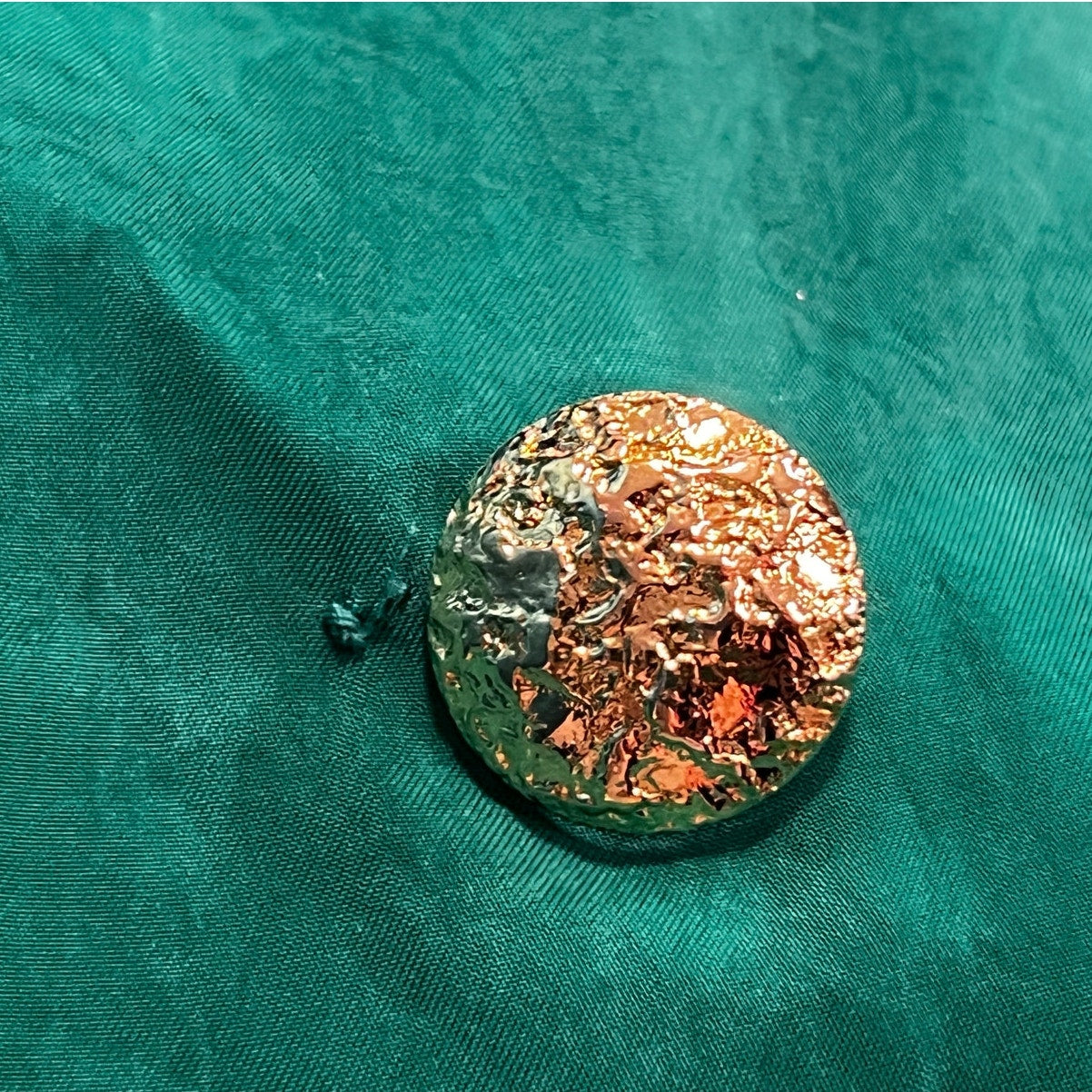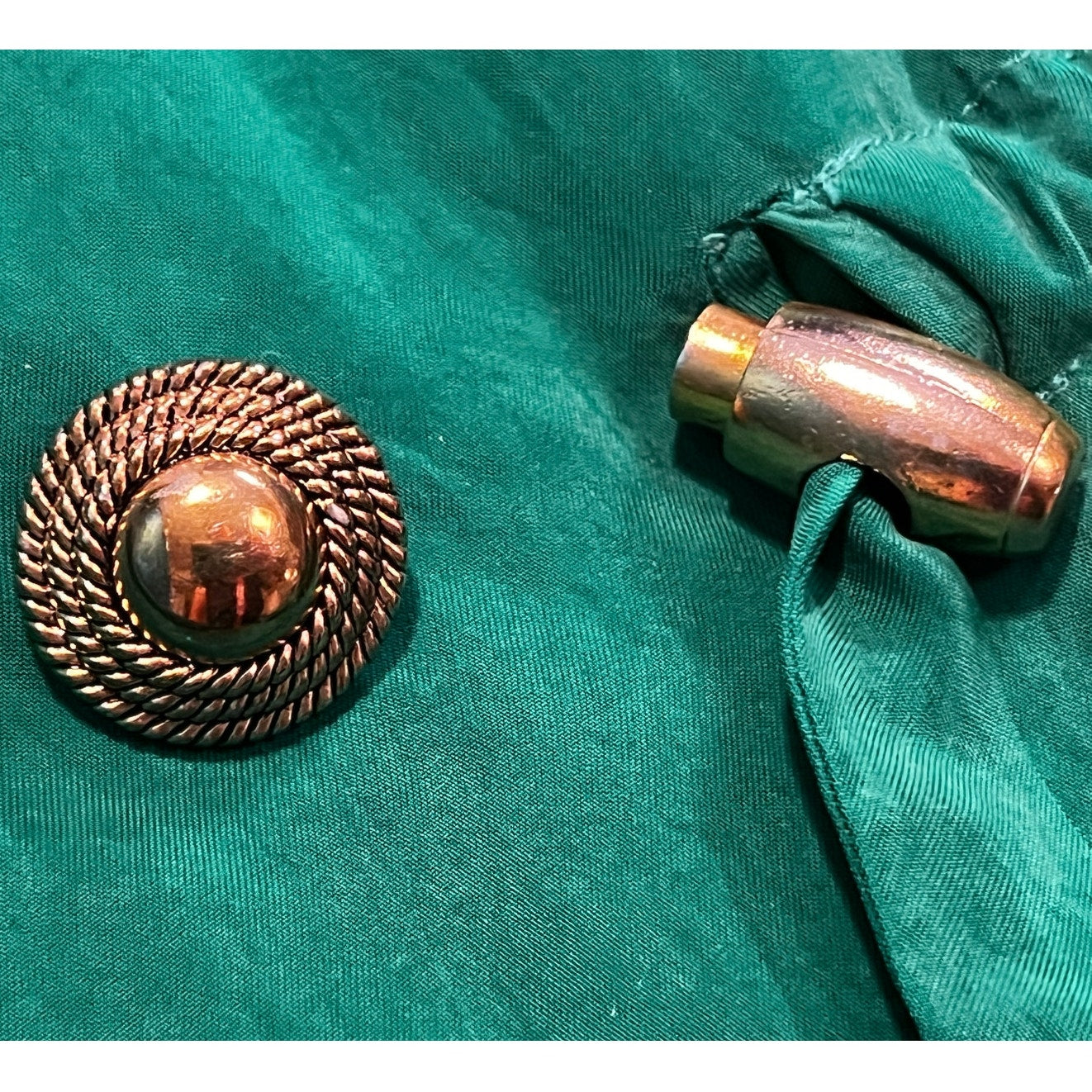 Vintage blazer in emerald green with a silk feel, drawstring at waist, and gold hardware details.  Truly unique and fabulous.  Size label is medium, but there is no brand or fabric tag.  Feels like silk or a silk blend.  Lined at interior.  Generally good vintage condition with some light water spots at the lapels (pictured above), and minor scratches at hardware.  Please see measurements when flat below:
